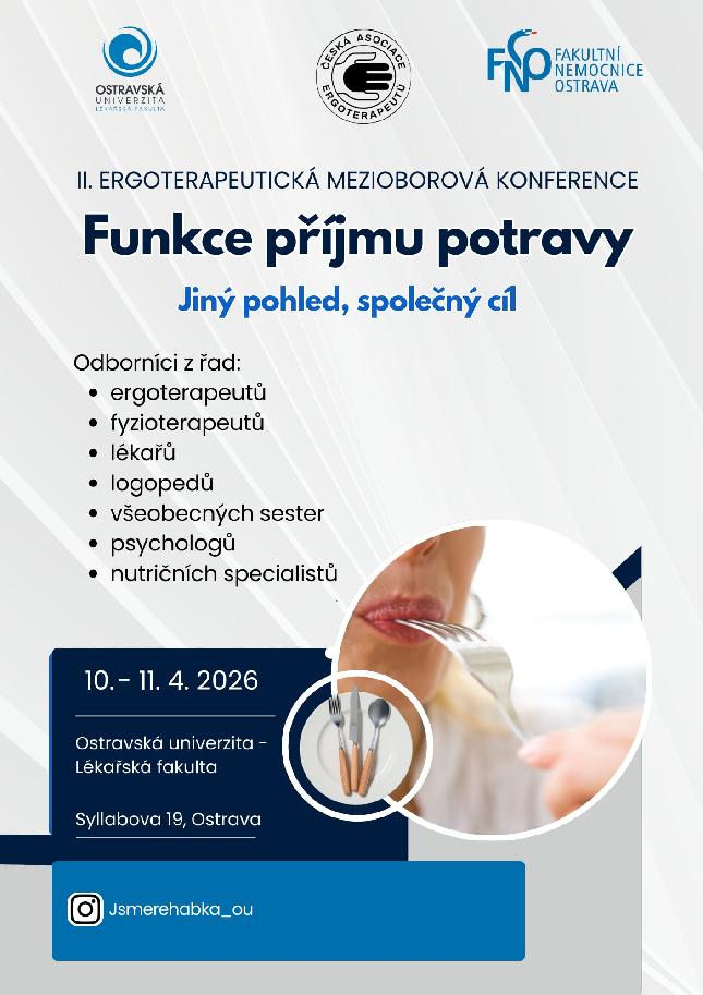 dovolujeme si Vás tímto pozvat na 2. ergoterapeutickou mezioborovou konferenci „Funkce příjmu potravy – jiný pohled, společný cíl“, která se uskuteční v dubnu 2026 v Ostravě.
